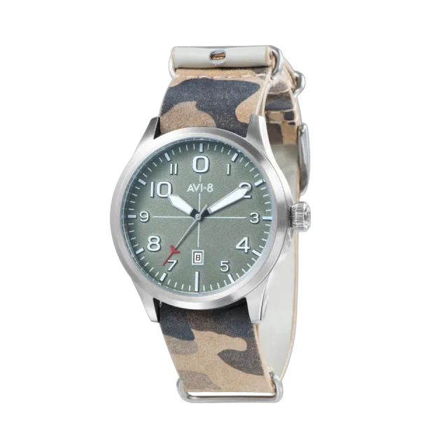 Grey Camo | Flyboy Cadet Japan Quartz, AVI-8'in ikonik pilot saatlerinden biridir. 43 mm paslanmaz çelik kasa, 22 mm kahverengi deri kayış ve 5 ATM su geçirmezlik özelliği ile hem şık hem de dayanıklıdır. Yeşil kadranı, Swiss Newlite ile embos edilmiş indeksler ile aydınlatılmıştır. Modern Japon Quartz mekanizması, güvenilir bir zaman ölçümü sunar. Her ortamda stilinizi tamamlayacak bu saat, hem vintage hem de modern tasarım tutkunları için idealdir.