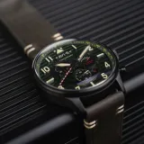 Roberts | Flyboy Spirit Of Tuskegee Chronograph, sınırlı sayıda üretilmiş 860 parçadan biridir. Bu özel saat, Kaptan Matthew Quy ve eşi Tina'nın, Tuskegee Hava Şehitleri'ni eğitmek için kullanılan vintage Stearman biplanını restore etme hikayesini anlatır. 44 mm paslanmaz çelik kasa, Japon Meca-quartz kronograf mekanizması ve 5 ATM su geçirmezlik özelliği ile dikkat çeker. Yeşil deri kayışı ve anti-refleksiyon kaplamalı mineral camı ile şıklığı ve dayanıklılığı bir arada sunar.