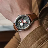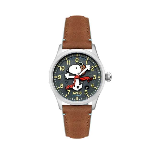 Pilot Grey | Flyboy Engineer Automatic, AVI-8'in Peanuts Snoopy serisinin özel bir parçasıdır. Sadece 450 adet üretilen bu saat, Snoopy ve Woodstock'un eğlenceli dünyasını yansıtır. 41 mm paslanmaz çelik kasa, Japon otomatik mekanizma ve 5 ATM su geçirmezlik özelliği ile dikkat çeker. Gri kadranı, Swiss Newlite ile uygulanan indeksler ve anti-refleksiyon kaplamalı safir cam ile korunur. 22 mm kahverengi deri kayışı, şıklığı ve konforu bir arada sunar.