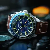 Hawker Hunter Atlas GMT Automatic, ikonik bir tasarıma sahip olan bu saat, British havacılığının simgesi Hawker Hunter jetinden ilham alıyor. 44 mm paslanmaz çelik kasa ve 22 mm kahverengi deri kayışı ile şıklığı ve dayanıklılığı bir araya getiriyor. Japon otomatik GMT hareketi sayesinde üç farklı zaman dilimini takip edebilir, seyahatlerinizde mükemmel bir yol arkadaşı olur. Mavi kadranı ve uygulamalı indeksleriyle dikkat çeken bu saat, modern gezginler için tasarlandı.