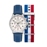Hawker Hurricane Classic Chronograph, Blue White modeli, II. Dünya Savaşı'nın en ikonik uçaklarından birine selam duruyor. Zarif ve sade tasarımı, cesur hatlarıyla dikkat çekiyor. Beyaz kadran üzerinde yer alan canlı renkler ve grafikler, bu efsanevi savaş uçağının etkileyici motifini yansıtıyor. 43.5 mm paslanmaz çelik kasa, Japon Quartz mekanizması ve 22 mm mavi deri kayışı ile hem şık hem de dayanıklı bir seçenek sunuyor. 5 ATM su geçirmezlik özelliği ile günlük kullanım için idealdir.