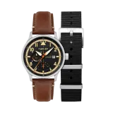 Metropolis Black | Hawker Hurricane McKellar Dual Time, AVI-8'in ikonik tasarımıyla dikkat çeken bir saat. 44 mm paslanmaz çelik kasa, Japon quartz hareketi ve çift zaman özelliği ile donatılmıştır. Siyah kadranı, uygulamalı indeksleri ve mineral camı ile şıklığı ön planda tutar. 22 mm kahverengi gerçek deri kayış ve ekstra siyah naylon kayış ile birlikte gelir. 5 ATM su geçirmezlik özelliği, günlük kullanımda güvenilirlik sağlar. Bu saat, cesur pilot Archie McKellar'ın mirasını yansıtır.
