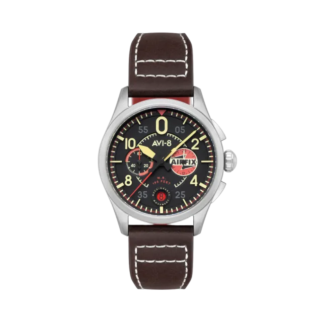 Raven Black | Spitfire Lock Chronograph Airfix Edition, AVI-8'in özel koleksiyonlarından biridir. Bu saat, Japon Meca-quartz mekanizması ile donatılmış olup, 42 mm paslanmaz çelik kasa ve 22 mm kahverengi gerçek deri kayışa sahiptir. Siyah kadranı, Swiss Newlite ile uygulanan indeksler ile şıklık katarken, mineral camı ile dayanıklılık sunar. 5 ATM su geçirmezlik özelliği ile günlük kullanıma uygundur. Her detayında mükemmel mühendislik ve estetik barındıran bu saat, askeri havacılığın tarihine bir saygı duruşudur.