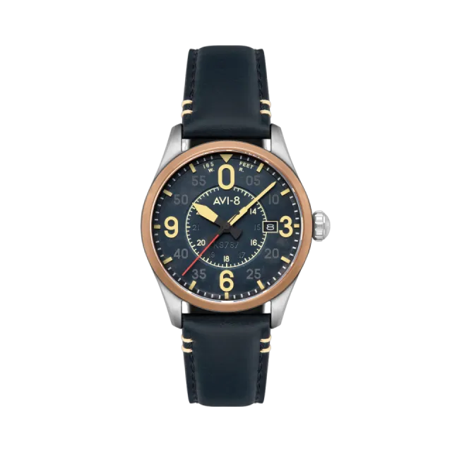 Distressed Blue | Spitfire Smith Automatic, AVI-8 Timepieces'in zarif mühendislik ürünü pilot saatidir. Joseph Smith'in ilham verici tasarımını kutlayan bu saat, 42 mm paslanmaz çelik kasa ve bronz kaplama bezel ile dikkat çeker. Mavi kadranı, Swiss Newlite ile uygulanan indeksler ve safir cam ile korunur. 22 mm gerçek deri kayışı, şıklığı ve konforu bir arada sunar. 5 ATM su geçirmezlik özelliği ile günlük kullanım için idealdir.