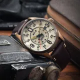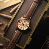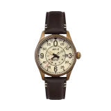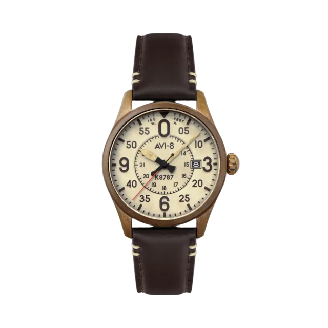 Oxidized Bronze | Spitfire Smith Automatic, AVI-8 Timepieces'in zarif mühendislik harikası pilot saatidir. Joseph Smith'in ilham verici tasarımını kutlamak için tasarlanmıştır. 42 mm'lik bronz kasa, antik görünümüyle dikkat çekerken, tam lume kadranı her koşulda mükemmel görünürlük sağlar. 22 mm'lik kahverengi deri kayışı ve safir camı ile şıklığı bir araya getirir. 5 ATM su geçirmezlik özelliği ile günlük kullanıma uygundur.
