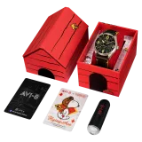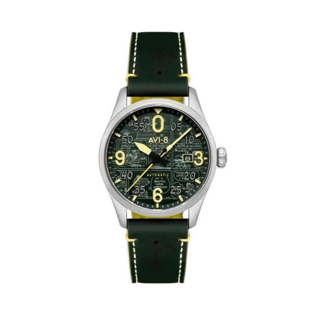 Aviator Green | Spitfire Smith Automatic, sınırlı sayıda üretilmiş 300 parçadan oluşan özel bir koleksiyondur. Snoopy ve Woodstock'un eğlenceli dünyasından ilham alan bu saat, 42 mm paslanmaz çelik kasası ve 22 mm yeşil deri kayışı ile dikkat çeker. Japon otomatik mekanizması, tarih göstergesi ve anti-refleksiyon kaplamalı safir camı ile hem şık hem de işlevseldir. 5 ATM su geçirmezlik özelliği ile günlük kullanıma uygundur. Her detayıyla nostaljik bir yolculuğa davet ediyor.