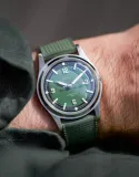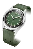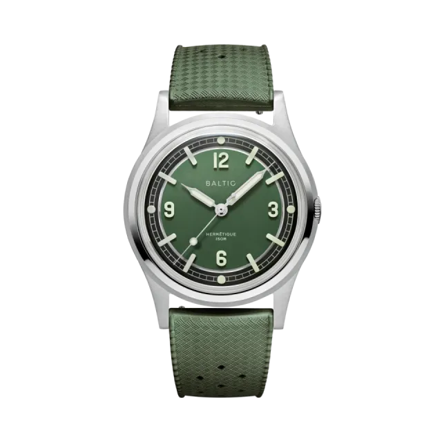 Hermétique Tourer Green, 37mm çapı ile keşif için tasarlanmış çok yönlü bir saat. 316L paslanmaz çelik kasası ve çift kubbe safir camı ile dayanıklılığı ön planda tutuyor. 150m su geçirmezlik özelliği, günlük kullanımda güvenilirlik sağlıyor. Mat yeşil kadranı, Super-Luminova® C3 X1 ile aydınlatılmış saat işaretleriyle donatılmış, karanlıkta bile okunabilirliği artırıyor. Otomatik Miyota 9039 mekanizması, 42 saat güç rezervi sunarak her koşulda hassasiyet sağlıyor.