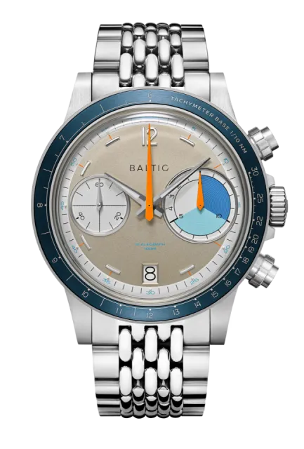 Scalegraph Transat Café L'Or - Limited Edition, Baltic Watches'ın 2025 yılına özel su geçirmez kronografıdır. Sadece 200 numaralı parça ile sınırlı olan bu saat, Transat Café L'Or'un resmi zaman tutucusu olarak ilk yılını kutluyor. 39.5 mm paslanmaz çelik kasası, 100 metre su geçirmezliği ve 63 saat güç rezervi ile dikkat çekiyor. Şık metalik şampanya kadranı ve parlak turuncu ibreleri, yarış koşullarında mükemmel okunabilirlik sağlıyor. Bu eşsiz saat, deniz tutkunları için vazgeçilmez bir parça.
