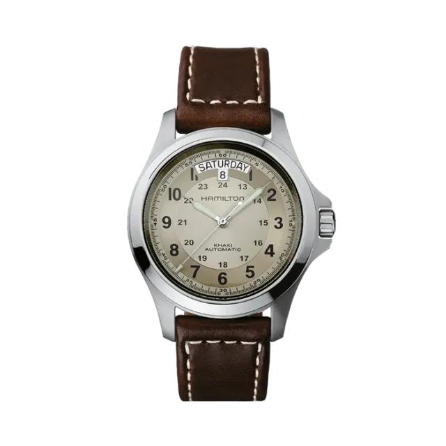 Hamilton Khaki Field King Auto, askeri mirasıyla güçlü bir tasarım sunuyor. 24 saat göstergesi ve özel muhafazalarıyla bu saat, şıklığı ve dayanıklılığı bir araya getiriyor. 40 mm stainless steel kasa ve safir kristali sayesinde çizilmelere karşı dayanıklı olan bu model, 80 saatlik gelişmiş güç rezervi sunuyor. Hayatın her anına uyum sağlayacak bu militer ilhamlı saat, maceraperest ruhlara hitap ediyor. Hemen keşfedin!