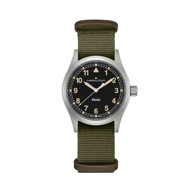 Hamilton'ın Khaki Field Quartz 38mm, askeri mirasını modern bir tasarımla buluşturuyor. Siyah kadranı, net tipografi ve eskitilmiş radyum renkli Super-LumiNova® indeksler ile dikkat çekiyor. Kolay okunabilir Arap rakamlarıyla kullanıcı dostu bir deneyim sunan bu saat, yeşil tekstil NATO kayışı ile şıklığı ve dayanıklılığı bir araya getiriyor. Maceralarınız için ideal bir yol arkadaşı olan bu model, sizi her adımda destekler.