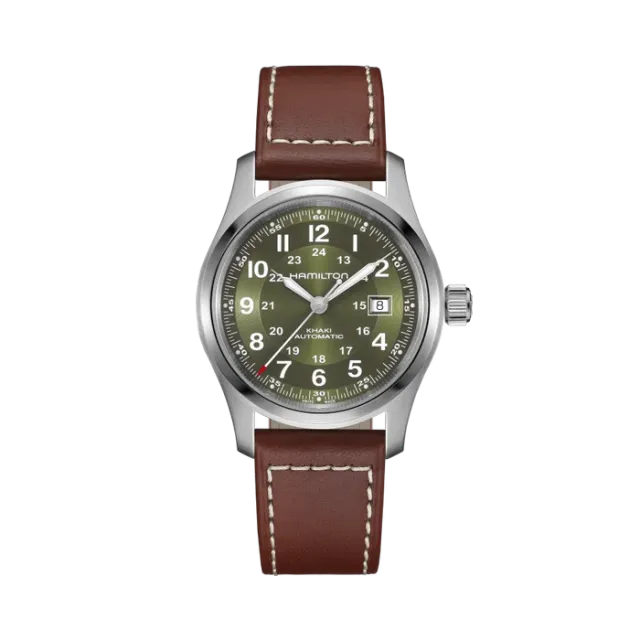 Hamilton'un Khaki Field Automatic 42mm modeli, orijinal askeri saatlerden ilham alarak tasarlanmıştır. Haki yeşili kadranı ve benzersiz spiral efektleri ile şıklığı ve işlevselliği bir araya getiriyor. Özellikle macera severler için tasarlanmış H-10 otomatik kalibre, 80 saatlik güç rezervi sunarak her an yanınızda. Suya dayanıklılığı ve etkileyici görünümü ile bu saat, modern yaşamın dinamiklerine uyum sağlıyor. Khaki Field koleksiyonunu keşfedin!