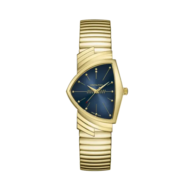 Hamilton'ın ikonik Ventura Quartz, 1957'de tanıtılan ilk elektrikli saat olma özelliğiyle dikkat çekiyor. Koyu mavi kadranı ve nikel kaplama altın PVD kasasıyla göz alıcı bir tasarıma sahip. 32mm x 50mm boyutlarıyla hem şık hem de modern bir görünüm sunan bu saat, esnek paslanmaz çelik kayışı ile kullanıcısına konfor sağlıyor. 5 bar su geçirmezlik özelliği ile her anınızı şıklıkla yaşamanızı sağlıyor. Ventura, zamansız ve fütüristik bir stil arayanlar için mükemmel bir seçim!