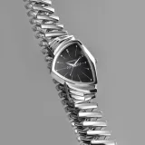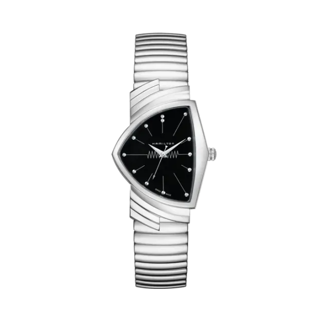 Hamilton Ventura Quartz, Rock 'n' Roll'un ikonu olan Elvis Presley'in stiline ilham veren bir saat olarak karşınıza çıkıyor. Siyah kadranı ve dayanıklı paslanmaz çelik kasasıyla şıklığı ve modernizmi bir arada sunuyor. 32mm x 50mm boyutundaki bu çığır açan tasarım, üstün quartz mekanizmasıyla zamanın akışını en doğru şekilde takip ediyor. 50 metre su geçirmezliğiyle hem günlük hem de özel anlar için mükemmel bir seçenek.