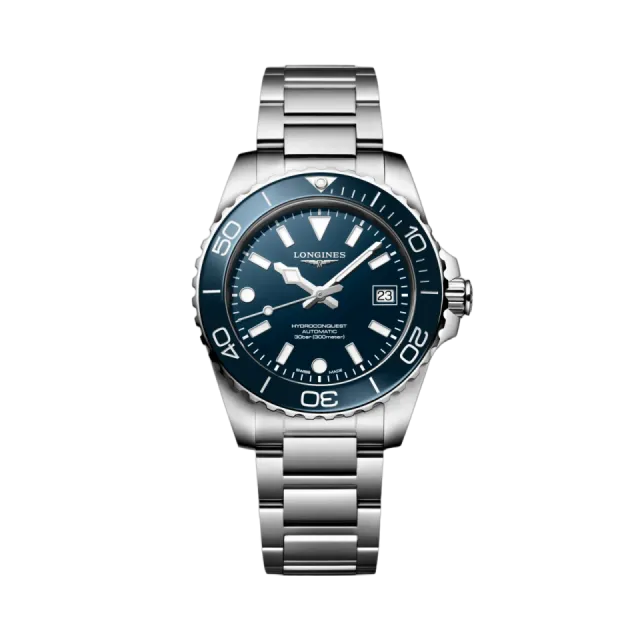 Longines HYDROCONQUEST, 39 mm çapında mavi laker cilalı kadranı ve paslanmaz çelik ile seramik malzemesiyle dikkat çekiyor. Otomatik mekanizması, 30 bar (300 m) suya dayanıklılığı ve tek yönlü döner bezel özelliği ile hem şıklığı hem de dayanıklılığı bir arada sunuyor. Swiss Super-Luminova® ile aydınlatılan kadranı, her ortamda mükemmel bir görünüm sağlıyor. Modern tasarımıyla HYDROCONQUEST, stil sahibi bireyler için ideal bir seçimdir.