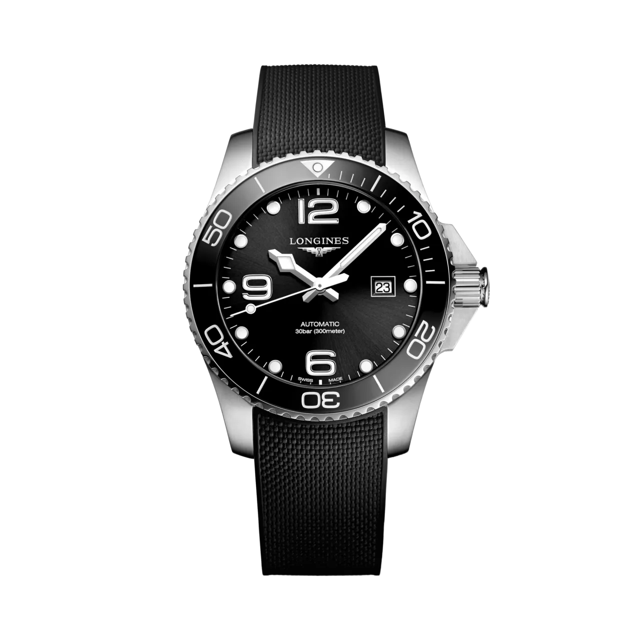Longines HydroConquest L37824569, 43 mm paslanmaz çelik kasası ve siyah kauçuk kordonuyla sportif bir şıklık sunar. Otomatik mekanizma, 72 saat güç rezervi ve 30 bar su geçirmezlik ile üstün performans sağlar. Siyah seramik bezeli, safir camı ve Super-LumiNova aydınlatmasıyla dikkat çeken bu Swiss Made erkek saat, dayanıklılık ve zarafeti bir araya getiriyor.
