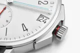 NOMOS Glashütte'nin Ahoi neomatik 38 date modeli, zarafet ve spor şıklığı bir araya getiriyor. 38.5 mm çapındaki ince paslanmaz çelik kasası, 20 atm su geçirmezlik özelliği ile hem karada hem de su altında mükemmel bir performans sunar. Beyaz gümüş kaplama kadranı, mavi ve kırmızı detaylarla zenginleştirilmiştir. Otomatik DUW 6101 mekanizması, büyük tarih penceresi ile işlevselliği artırırken, Superluminova sayesinde düşük ışıkta bile mükemmel okunabilirlik sağlar.