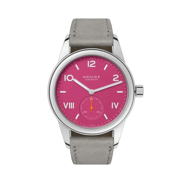 Club Campus deep pink, NOMOS Glashütte'nin zarif ve dikkat çekici tasarımıyla öne çıkıyor. 36 mm çapında, suya dayanıklı paslanmaz çelik kasa ile donatılmış bu saat, 100 metre derinliğe kadar su geçirmezlik sunuyor. Superluminova kaplamalı rakamlar ve neon turuncu saniye ibresi, karanlıkta ve su altında mükemmel görünürlük sağlıyor. Hafif ve konforlu velur deri kayışı, şıklığı ve rahatlığı bir arada sunuyor. Bu saat, pozitif bir yaşam tarzını simgeliyor.