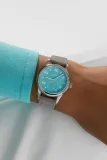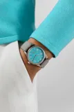 NOMOS Glashütte'nin Club Campus endless blue modeli, zamansız tasarımı ve yüksek kaliteli mekanizmasıyla dikkat çekiyor. 36 mm çapındaki paslanmaz çelik kasa, 8.2 mm kalınlığıyla günlük kullanıma uygun bir şıklık sunuyor. El yapımı DUW 4001 mekanizması, 53 saatlik güç rezerviyle güvenilir bir performans sağlıyor. Vegan velour kayışı, hem çevre dostu hem de konforlu bir kullanım sunarken, canlı renkleriyle de stilinize enerji katıyor. Bu saat, mekanik saat dünyasına mükemmel bir giriş niteliğinde.