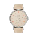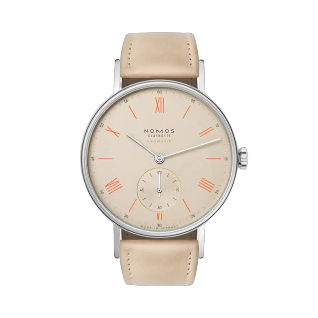NOMOS Glashütte'nin Ludwig neomatik champagne modeli, zarif tasarımı ve modern detaylarıyla dikkat çekiyor. 36 mm çapında, 7 mm yüksekliğinde ve 5 atm su geçirmezlik özelliği sunan bu saat, otomatik DUW 3001 mekanizmasıyla çalışıyor. Şampanya altın kadranı, neon turuncu Roma rakamlarıyla şıklık katarken, ince deri kayışı konfor sağlıyor. Minimalist ve zarif yapısıyla her ortamda stilinizi tamamlayacak.