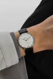 NOMOS Glashütte'nin Metro 38 date modeli, ödüllü ve avant-garde tasarımıyla dikkat çekiyor. Mark Braun'ın imzasını taşıyan bu saat, 38.5 mm çapında, el yapımı DUW 4601 mekanizması ile donatılmıştır. İnce profili (7.8 mm) ve zarif paslanmaz çelik kasası, suya dayanıklılığı (5 atm) ile birleşerek şıklığı ve işlevselliği bir arada sunar. Beyaz gümüş kaplama kadranı, siyah indeksler ve kırmızı saniye ibresi ile göz alıcı bir estetik sunar. Horween Genuine Shell Cordovan deri kayışı, konforlu bir kullanım sağlar.