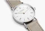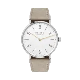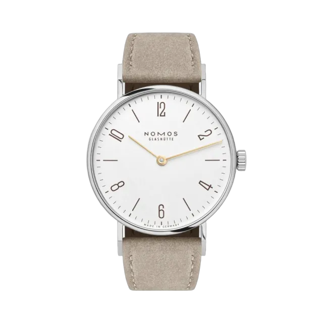 NOMOS Glashütte'nin Tangente 33 duo modeli, zarif tasarımı ve 33 mm çapıyla ince bilekler için mükemmel bir uyum sunar. Paslanmaz çelik kasası ve beyaz gümüş kaplama kadranı, altın renkli iki el ile şıklığı tamamlar. DUW 4001 Duo mekanizması, hassas zaman tutma yeteneği ile dikkat çekerken, vegan velur kayışı konforlu bir kullanım sağlar. Modern ve klasik tasarımın buluştuğu bu saat, her ortamda şıklığınızı artıracak.