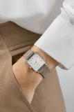 NOMOS Glashütte'nin Tetra 27 duo modeli, zarif tasarımıyla ince bilekler için mükemmel bir uyum sunuyor. 27 mm'lik yan uzunluğu ve 6.1 mm'lik ince profili ile dikkat çeken bu saat, altın renkli iki zarif kolla donatılmıştır. Beyaz gümüş kaplama kadranı ve mocha kahverengi tipografisiyle şıklığı ön plana çıkarır. 5 atm su geçirmezlik özelliği ve el yapımı DUW 4001 Duo mekanizması ile hem estetik hem de işlevsellik sunar.